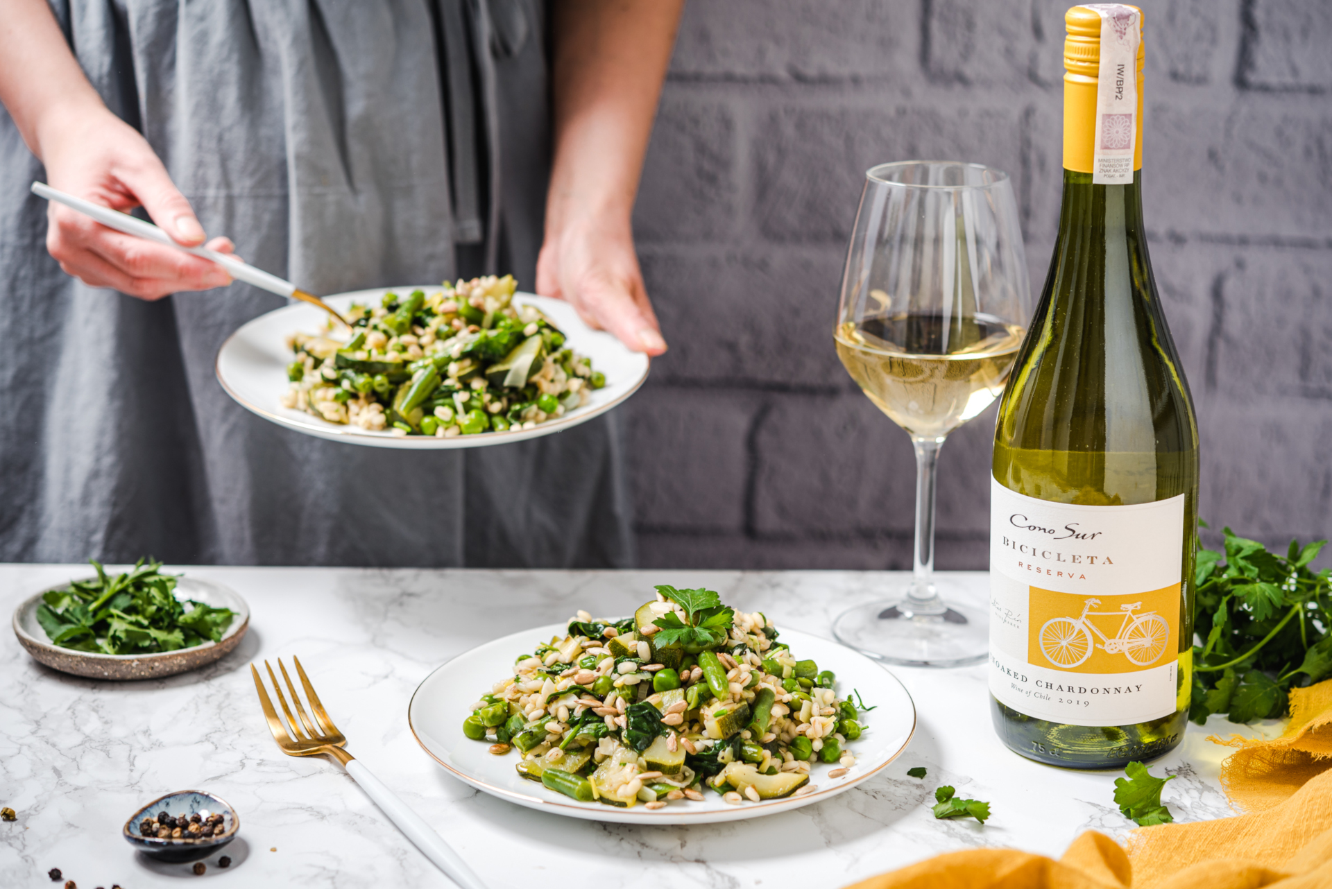 Na patelni rozgrzewamy oliwę z oliwek. Podsmażamy na niej czosnek i pora przez około minutę. Wrzucamy suchą kaszę pęczak i smażymy jeszcze 2 minuty. Zalewamy wszystko winem i gotujemy aż kasza wchłonie płyn. Dodajemy cukinię i stopniowo dolewamy bulion, każdorazowo czekając aż kasza wchłonie poprzednio wlaną porcję. Pod koniec gotowania dodajemy groszek, fasolkę i szpinak. Po około 20 – 30 minut kasza powinna być już gotowa.