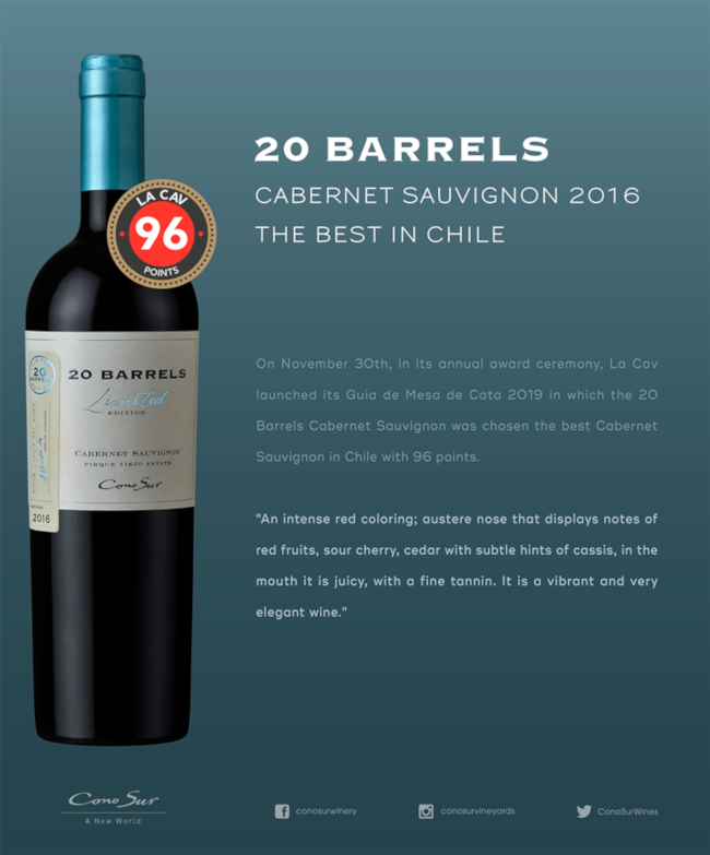 Jakość win Cono Sur została doceniona także przez zespół chilijskiego Klubu Miłośników Wina La Cav. Wino 20 Barrels Cabernet Sauvignon 2016 znalazło się w najnowszej edycji przewodnika La Cav – Guia de Mesa de Cata 2019 – z notą 96 punktów i tytułem najlepszego chilijskiego Cabernet Sauvignon. Intensywny czerwony kolor, soczyste podniebienie i gładkie taniny zyskały duże uznanie specjalistów. Jesteśmy przekonani, że propozycja Cono Sur przypadnie do gustu i Tobie!