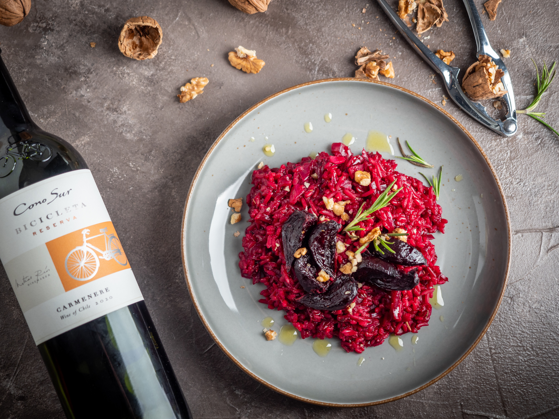 Risotto podawaj z posiekanymi orzechami włoskimi, pokrojonym burakiem oraz oliwą truflową.