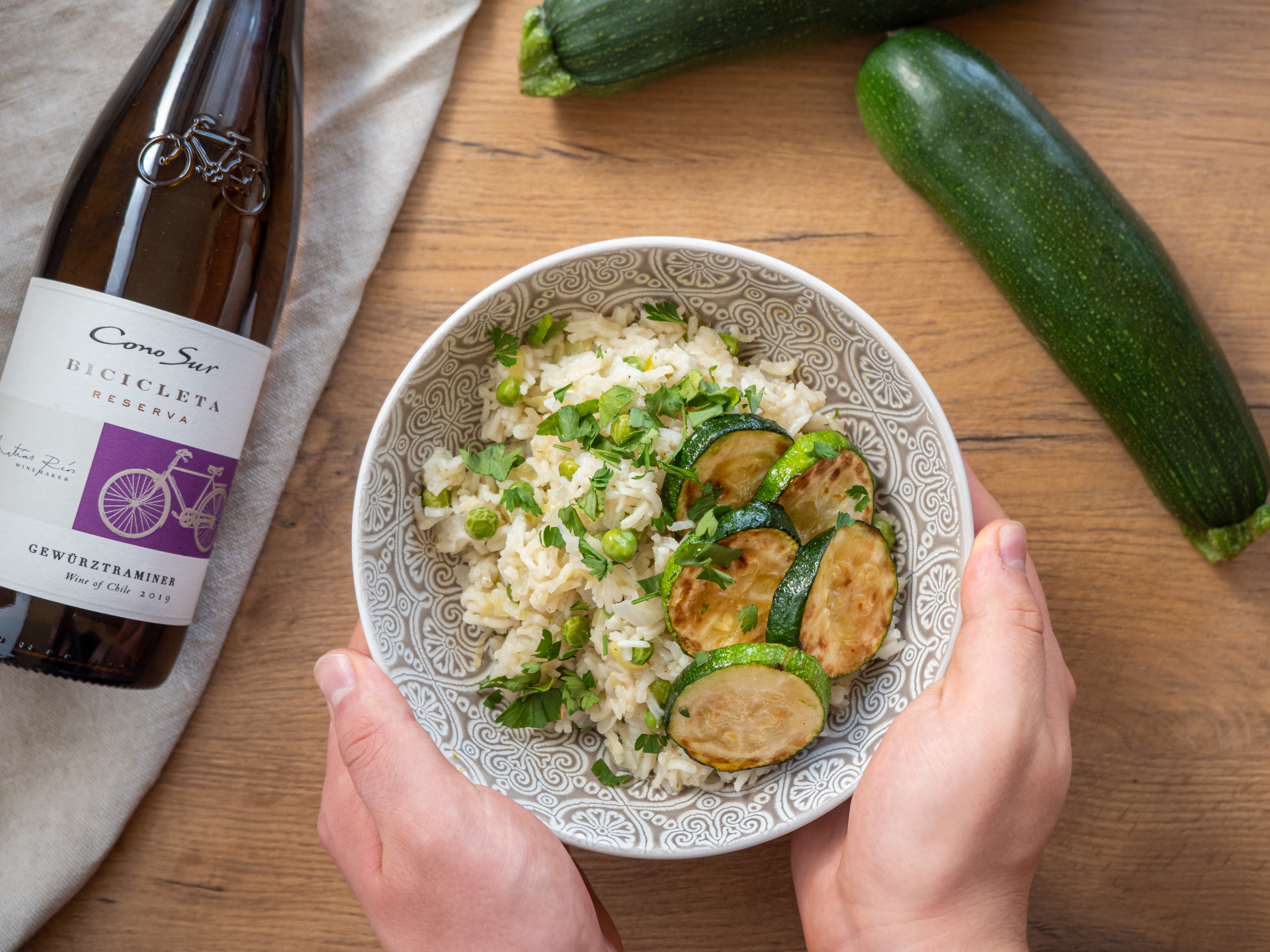 Gdy ryż już jest prawie gotowy, dodaj mrożony groszek, opcjonalnie płatki drożdżowe i gotuj jeszcze przez chwilę. Dopraw do smaku solą i pieprzem. Podawaj z zieloną pietruszką i smażoną cukinią.