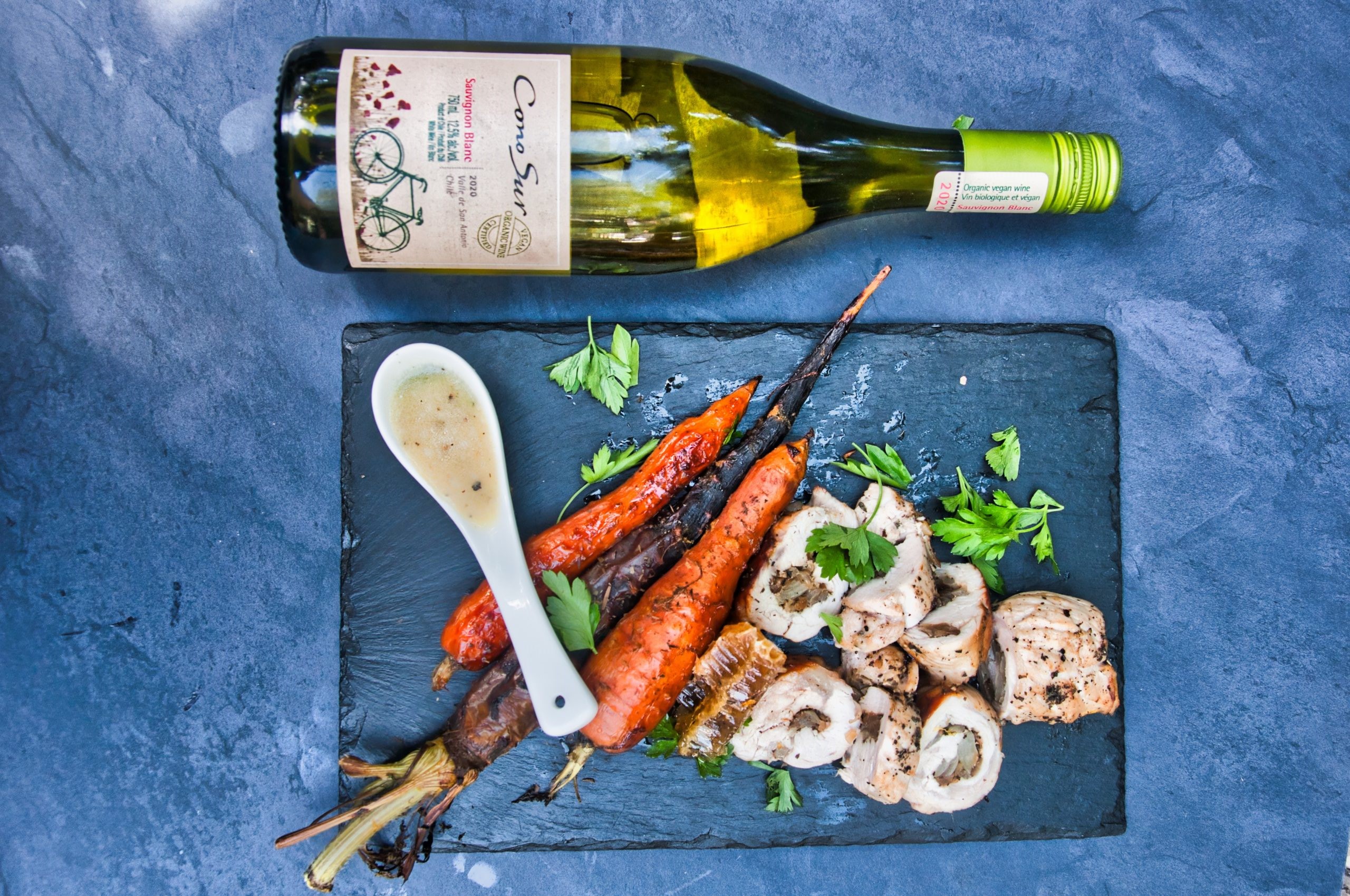 Przygotuj marchewkę: rozgrzej piekarnik do 200 C, wymieszaj wszystkie składniki marynaty. Wyłóż naczynie żaroodporne papierem do pieczenia, włóż obrane marchewki i zalej dokładnie marynatą. Piecz przez ok. 40 minut, aż marchewki będą miękkie, ale wciąż jędrne.