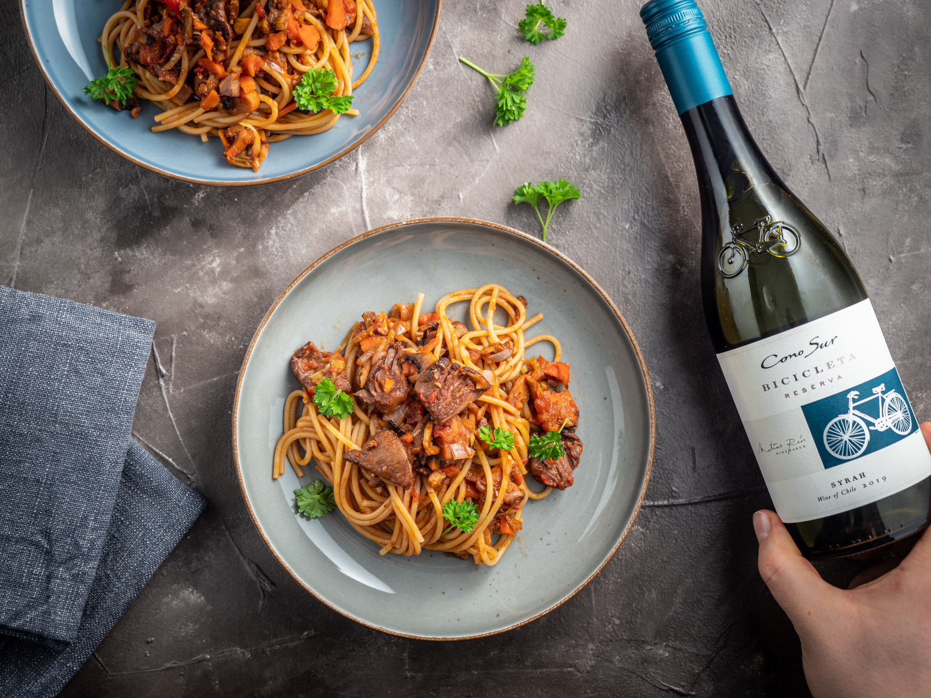 W garnku rozgrzej olej. Boczniaki pokrój w średnią kostkę i podsmaż na złoty kolor. Dodaj pomidory, czerwone wino oraz cukier i gotuj przez 3-4 minuty. Wlej sos sojowy, wsyp przyprawy, dodaj posiekane upieczone warzywa i bardzo dokładnie wymieszaj. Dopraw do smaku.
