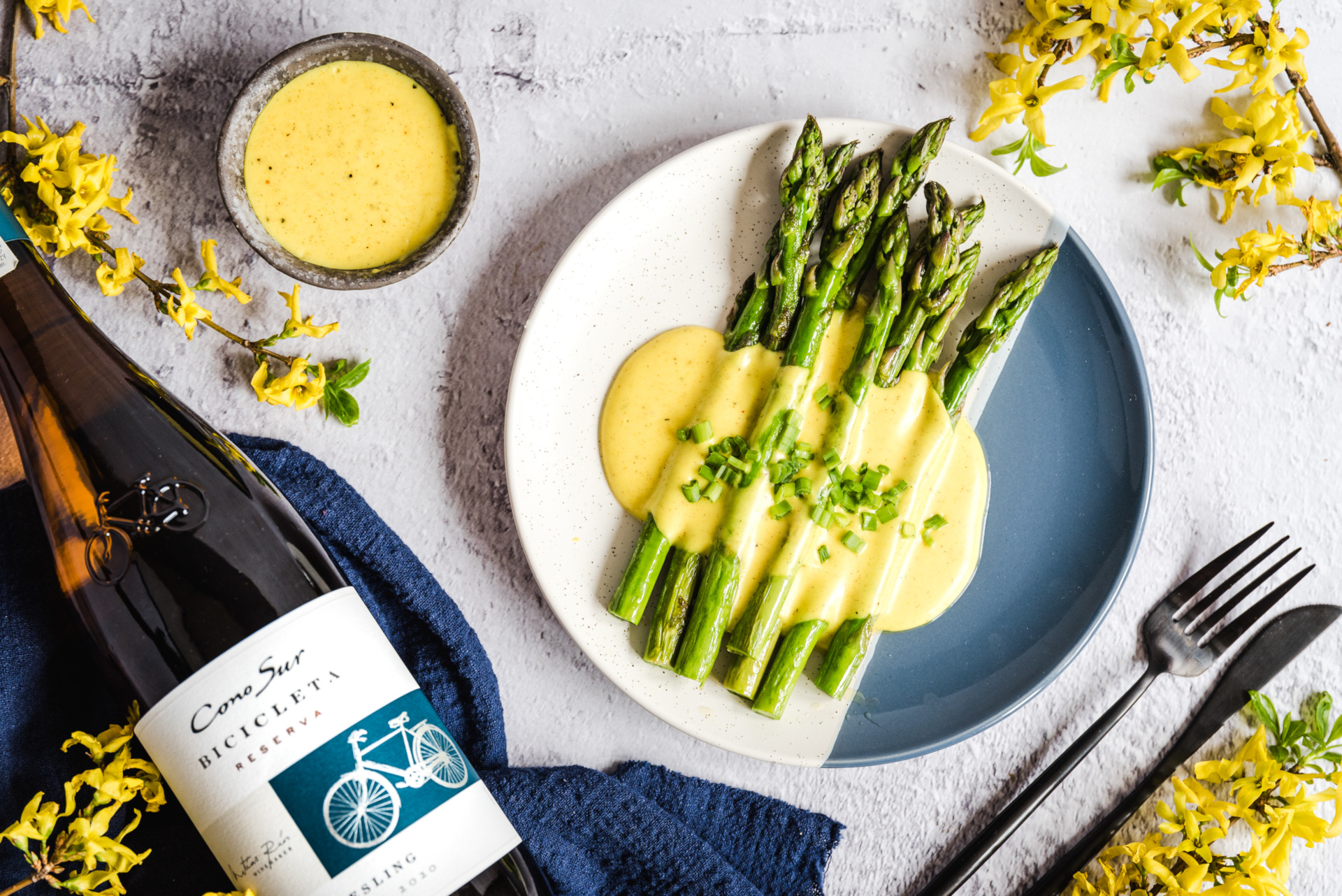 Odrywamy zdrewniałe końcówki szparagów (wystarczy je złamać), na patelni rozgrzewamy łyżkę oliwy i smażymy szparagi około 3 minuty. Wykładamy na talerze, polewamy sosem i posypujemy drobno posiekanym szczypiorkiem.