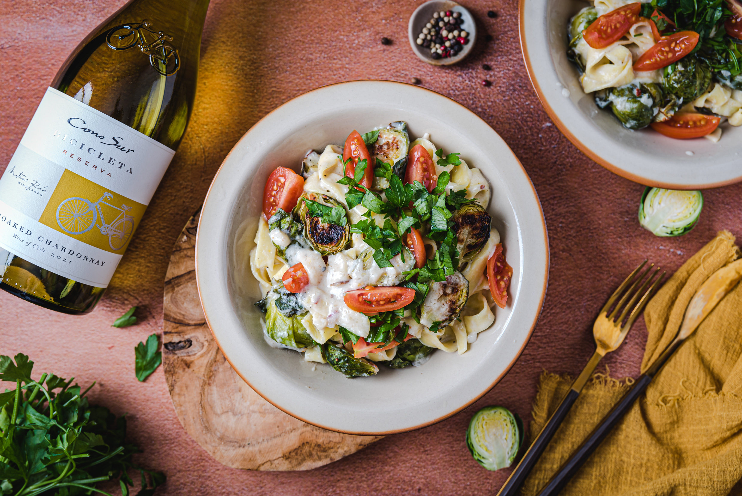 Siekamy czosnek i cebulę. W rondlu rozgrzewamy pozostałą oliwę, wrzucamy cebulę, a po minucie czosnek. Kiedy się zeszklą wlewamy wino i gotujemy kilka minut, aż połowa wyparuje. Mocno mieszając wsypujemy skrobię i nie przerywając mieszania dolewamy mleko. Po minucie blendujemy i gotujemy nadal, aż sos zacznie gęstnieć. Przyprawiamy solą, pieprzem, płatkami chilli i skórką cytrynową. Dodajemy płatki drożdżowe i mieszamy. Po kilku minutach sos powinien zgęstnieć – wtedy można wymieszać go z odcedzonym makaronem i upieczoną brukselką.