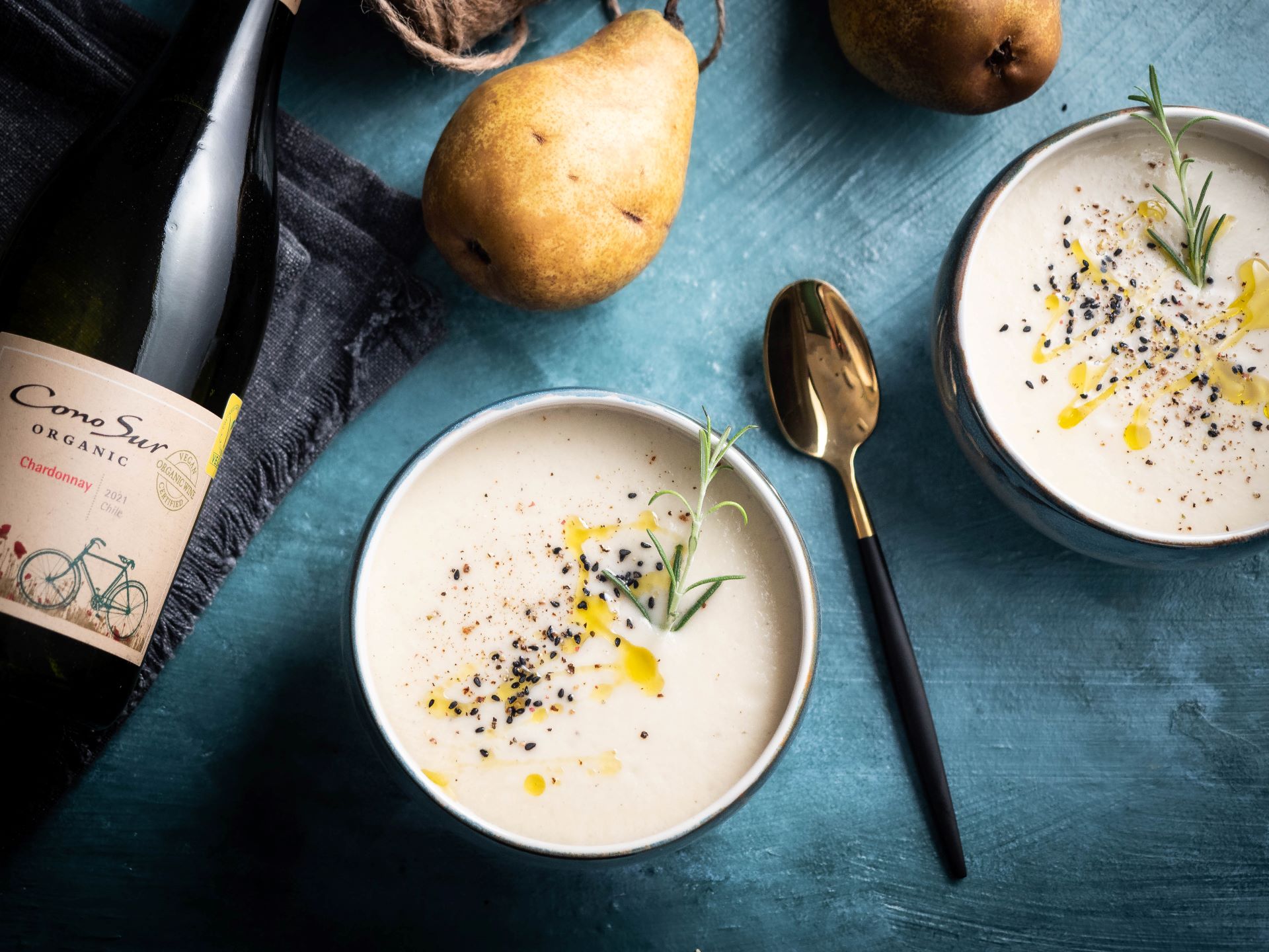Gruszkę obierz ze skórki, usuń gniazda nasienne, pokrój w kostkę i dorzuć do garnka. Wlej białe wino i duś przez kilka minut. Dolej bulion i gotuj przez około 15-20 minut, aż pietruszka zmięknie.